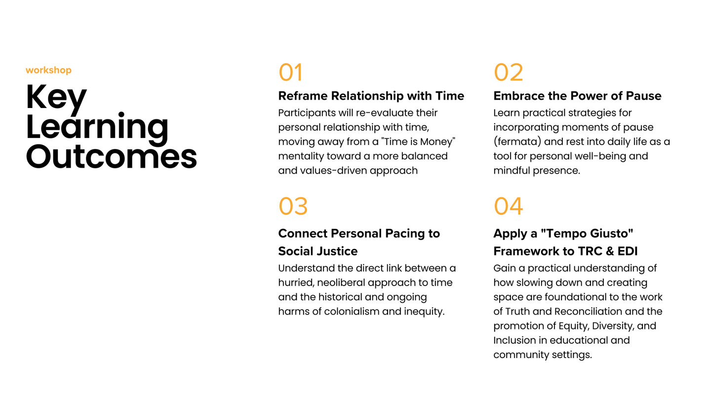 Tempo Giusto is a practical workshop for student-teachers and community members. Using the musical idea of the “right pace,” we practice slowing, pausing, and moving purposefully. Short reflections and exercises challenge productivity habits, creating space for deep listening that strengthens authentic TRC and EDI engagement.