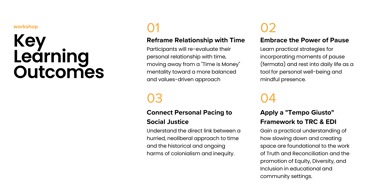 The workshop will frame the act of slowing down and pausing as a form of resistance to a colonial mindset. A curriculum designed with a "Time is Money" mentality often rushes past Indigenous histories and perspectives, reducing them to a single unit or a tokenistic activity.